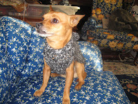 And finally, Baby, our Chihuahua mix. His ears are laid back because he's embarrassed about the sweater I tried making him and put on him anyway. He's kinda growling, I think, because Tigger is dorking with him - just outside the photo. Tigger was probably making fun of him or something. Poor Baby.